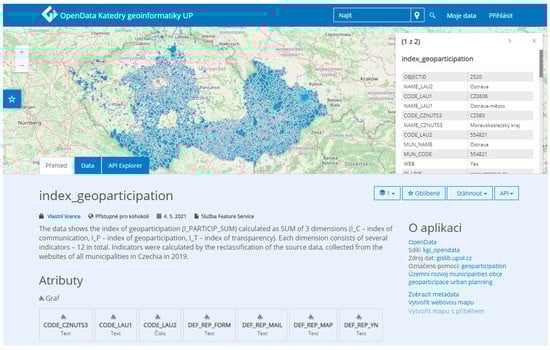 Data is published at Open Data Portal of Department of Geoinformatics, Palacký University Olomouc, available at URL https://gislib.upol.cz/portal/apps/sites/#/opendata (accessed on 8 July 2021). It contains dozens of datasets divided by categories. Each dataset is available via a specific URL. Our published dataset is available at https://tinyurl.com/geoparticipation (accessed on 8 July 2021).