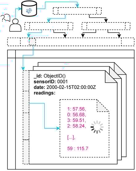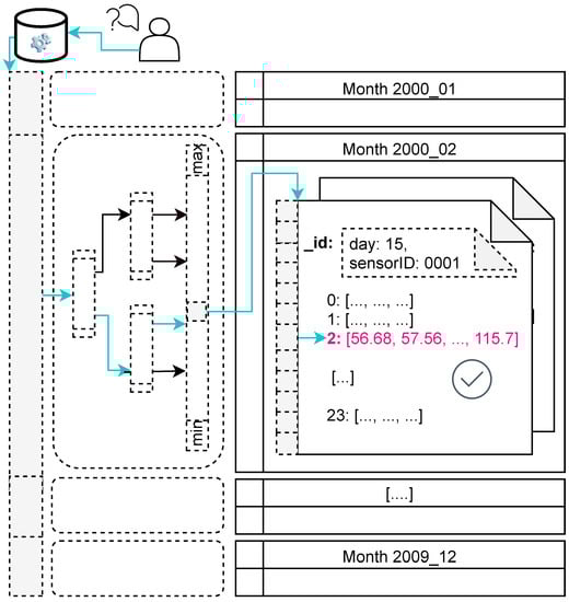 Sensor readings, containerized in buckets as explained in Section 4.1 and in Figure 1, are hash-distributed and grouped, according to time, in so-called MongoDB collections. More precisely, a MongoDB collection, containing a set of documents sorted by a B-Tree, is intended to keep the data produced in a given month, and in a specific year. For example, as it can be seen in Figure 1, the bucket containing the readings of sensor 0001 for the day 15 February 2020 is classified in the collection Month 2000_02.