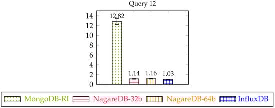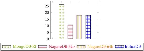 Laying in the middle, NagareDB, uses an intermediate data model: While it is using a document-oriented (so, key-value) approximation as MongoDB-RI does, it holds much bigger columns than MongoDB-RI, but not as extensive as InfluxDB []. In addition, NagareDB uses ZSTD compression, which provides better compression ratio, at the expense of slightly slowing down insertion time [], following NagareDB’s resource-saving goals. This makes NagareDB data model a some-how hybrid between MongoDB-RI and InfluxDB, providing, thus, an intermediate performance. In addition, NagareDB-32b is able to slighly surpass NagareDB-64b, as the data types that it uses are smaller than its high-precision alternative version.