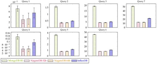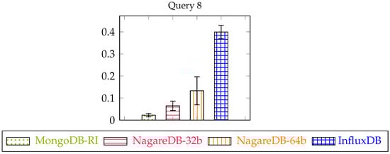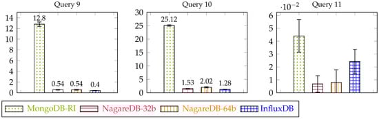 Both NagareDB and InfluxDB greatly surpass MongoDB-RI. This behavior is even more notable in downsampling queries (Q9–10), as seen in Figure 6. More precisely: