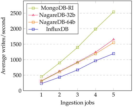 Regarding stream data ingestion, as seen in Figure 8, MongoDB-RI provides the fastest writes/second ratio. This is mainly due to two reasons: First, MongoDB-RI uses snappy compression, which provides a lighter but faster compression, in comparison to any compression technique that NagareDB or InfluxDB uses. Second, MongoDB-RI’s data model follows a document-oriented data model which is, in fact, a key-value approximation, where the value is a document that stores a small bucket, considered as a small column of sensor readings according to time.