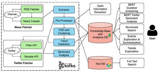 We store the knowledge base (KB) and the analysis in a MongoDB instance. In order to ensure an optimal performance, the appropriate indexes are used in the MongoDB database. In addition, the raw text data, both for Twitter as well as for the news, are stored in an elastic search instance in order to effectively search using free text. The architecture of News Monitor is shown in Figure 1.