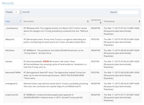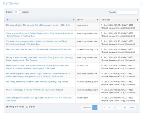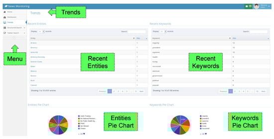 | 1 | System demonstration available in: http://195.134.67.89/news_monitor/ (accessed on 12 December 2021). |