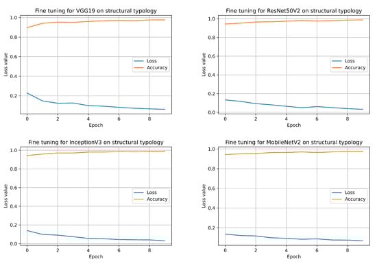 Still, only for the parameter structural typology, the graphs about the training for all employed CNNs models are reported, showing the trends of both loss and accuracy for transfer learning (Figure 3) and fine tuning (Figure 4) phases.