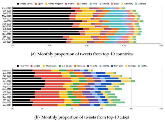 Next, the geotagging approach is applied on all the tweets in TBCOV, which identified 515,802,081 mentions of valid toponyms from tweet text and 180,508,901 from user profile description. More importantly, out of all 1,284,668,011 users’ self-declared locations in the user location field, 1,132,595,646 (88%) were successfully geotagged. Moreover, the process yielded 2,799,378 and 51,061,938 locations for geo-coordinates and place fields, respectively. Table 7 shows important geotagging results, including total occurrences, geotagging yield, and resultant resolved locations granularity at country, state, county, and city level. To determine the country, state, county, and city of a tweet, we mainly rely on three attributes. The first two attributes are users’ self-reported location in the user location or user profile description fields. GPS coordinates are used (if available) in case a tweet is not resolved through user location and user profile description fields. Altogether more than 1.8 billion locations corresponding to 218 unique countries, 2518 states, 26,605 counties, and 24,424 cities worldwide were resolved based on OpenStreetMap’s Nominatim database. The dataset contains 175 countries and 609 cities around the world with at least 100K tweets. Figure 3 depicts the monthly distribution of top-10 countries and cities throughout the data collection period.