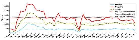 Understanding public opinion and sentiment is important for governments and authorities to maintain social stability during health emergencies and disasters [45,46]. Prior studies highlighted social networks as a potential medium for analyzing public sentiment and attitude towards a topic [47]. Opinionated messages on social media can vary from reactions on a policy decision [48] or expressions of sentiment about a situation[49] to sharing opinions during sociopolitical events, such as the Arab Spring [50]. Sentiment analysis, which is a computational method to determine text polarity, is a growing field of research in the text mining and NLP communities [51]. There is a vast literature on the algorithms and techniques proposed for sentiment analysis—detailed surveys can be found in [52,53,54]. Moreover, numerous studies employ sentiment analysis techniques to comprehend public sentiment during events ranging from elections and sports, to health emergencies [49,55]. We are interested in understanding the public sentiment perceived from multilingual and multi-topic COVID-19 tweets from worldwide.