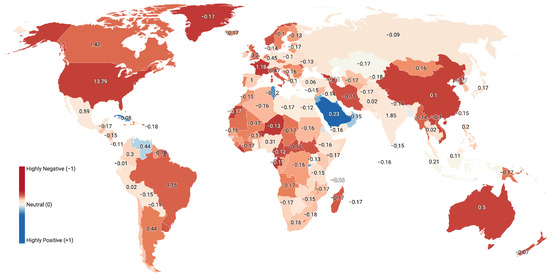 Figure 6 shows countries’ aggregated sentiment on a world map. The sentiment scores for countries represent normalized weighted averages based on the total number of tweets from a country and model’s confidence scores for positive, negative, and neutral tweets. Equation (1) shows the computation of weighted average sentiment score for a country: