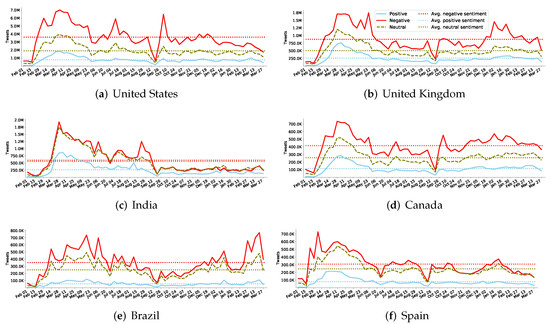 Figure 7 shows the weekly sentiment trends for the top-six countries (by total tweets in our data). Consistent to the worldwide sentiment trends, the negative sentiment of all six countries dominates throughout. Although a few countries (US, UK, and India) reach a couple million negative tweets for a few weeks, the other countries stay lower around half a million in the remaining weeks.