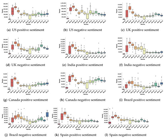 In Figure 8, we provide additional information about the distribution, skewness through quartiles, and median for positive and negative sentiments for the top-six countries. We notice that in most cases the highest variation in both positive and negative sentiment is observed in March 2020, corresponding to the earlier stages of the pandemic where the coronavirus was spreading rapidly around the globe. Most countries seem to have less dispersion in April 2020 with quite high maximum range of any type of sentiment. Then, we observe another high variation trend in both positive and negative sentiment but at a lower overall volume across all countries in September 2020, which corresponds to a time frame in which India was experiencing the peak of its first wave and Spain was experiencing the peak of its second wave. These interesting patterns can reveal many more hidden insights, which could help authorities gain situational awareness leading to timely planning and actions.