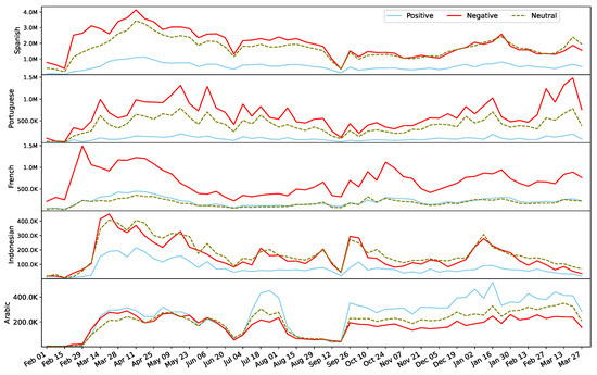 Figure 10 presents the distributions of sentiment labels for the top-five languages excluding English. Interestingly, the Arabic language shows the domination of the positive sentiment throughout the 14 months except February 2020 and a few weeks in the middle. Additionally, for the Indonesian language, the neutral sentiment is on par with negative sentiment, if not higher, throughout the entire data collection period. For the other three languages, the negative sentiment surpasses the other two sentiment classes. Although all languages show peaks in and around April and May 2020, the surge of the negative sentiment in February and March 2021 in the case of Portuguese is noticeable and requires further investigation.