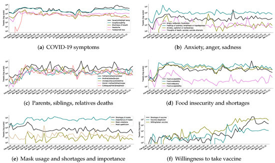 Twitter offers different APIs for data collection. We use the Twitter Streaming API, which allows for collecting tweets based on (i) a list of hashtags/keywords or (ii) geographical bounding boxes. Following the keyword-based streaming approach, we started our data collection on 1 February 2020 using trending hashtags such as #covid19, #coronavirus, #covid_19 and forming new keywords by pairing country names with different COVID-related terms for all countries (e.g., United States coronavirus and Brazil COVID-19). We then kept updating the keyword list based on the list of keywords used by Twitter for their COVID-19 data stream (https://developer.twitter.com/en/docs/labs/covid19-stream/filtering-rules (last accessed on 1 March 2021)). Additionally, we included other COVID-related hashtags as they trended on Twitter as well as keywords related to newly emerging situations such as a particular new symptom, vaccine development, food shortages, etc. In total, more than 800 multilingual keywords and hashtags encompassing a large set of topics including social distancing, shortages of masks, personal protective equipment (PPE), food, medicine, and reports of COVID-19 symptoms and deaths were used. Table 1 lists some of the terms while the full list of keywords can be found in Appendix A. Twitter offers filtered streams for specific languages; however, we did not filter by any language, and hence, our data is multilingual. Although the data collection was still running at the time of writing this manuscript, all the statistics and analyses presented in this study are based on data collected till 31 March 2021—i.e., 2,014,792,896 tweets. To the best of our knowledge, this is the largest multilingual Twitter dataset covering a broad spectrum of topics and issues the world has been facing amidst the COVID-19 pandemic.