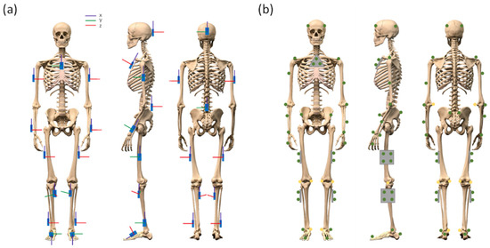 Placement of the inertial measurement units (a) and the reflective markers measured by the optical motion capture system (b).