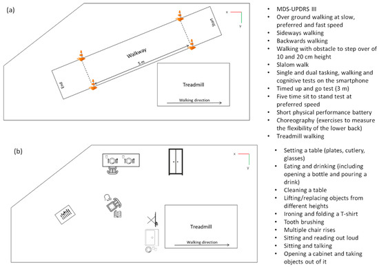 The setup of the lab for the standardized mobility assessments (a) and for the non-standardized activities of daily living (b). The assessments and tasks that were measured during both parts are described on the right side.