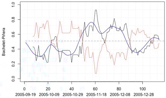 The results described below are favorable to the use of this data analysis technique. Each election is reviewed in detail, and the models that best fit the final result are compared. In the first modelling (Table 2), we work with the 2006 presidential campaign between Michelle Bachelet and Sebastián Piñera. Three ARIMA models were applied: (0,1,1), (2,1,3), and (2,1,2), with sigma2 values suitable for the modelling process. One of the differences between the three models applied can be seen in the standard error which is highly variable. However, the ARIMA modelling for the Hodrick–Prescott smoothed series, which has a very low standard error, gave an excellent forecast, differing by only 0.78% from the final election result of 53.5% for Michelle Bachelet. On the other hand, the moving average forecast had an error of only 0.36% in relation to the final election result, but with a standard error of 10.53%, so the most reliable and effective modelling series, in this case, was Hodrick–Prescott, as presented in Figure 1.