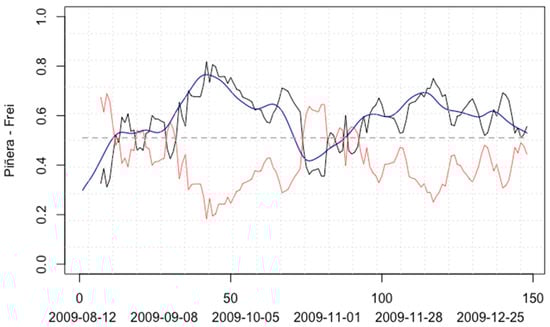 Forecasting the results of Piñera–Frei 2010. The red line represents the variation in interest over time in Frei, the black line represents the variation in interest over time in Piñera, and the blue line represents the smoothed interest over time in Piñera by the Hodrick–Prescott method.