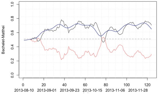 Forecasting the results of Bachelet–Matthei 2013. The red line represents the variation in interest over time in Matthei, the black line represents the variation in interest over time in Bachelet, and the blue line represents the smoothed interest over time in Bachelet by the Hodrick–Prescott method.