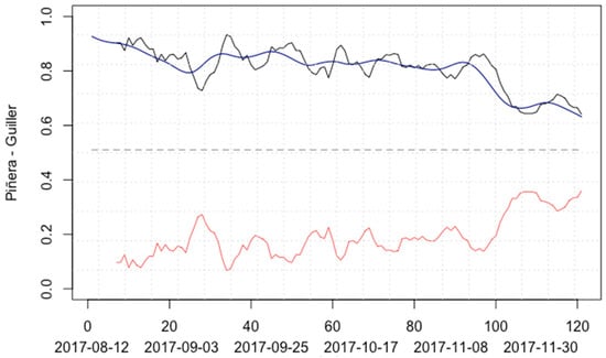 Forecasting the results of Piñera–Guillier 2017. The red line represents the variation in interest over time in Guillier, the black line represents the variation in interest over time in Piñera, and the blue line represents the smoothed interest over time in Piñera by the Hodrick–Prescott method.