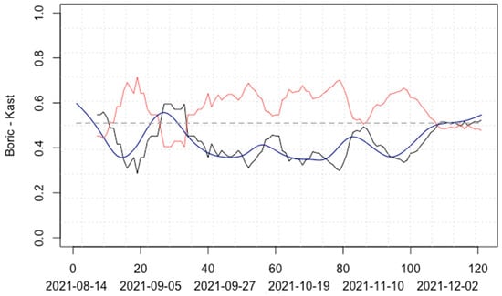 Forecasting the results of Boric–Kast 2021. The red line represents the variation in interest over time in Kast, the black line represents the variation in interest over time in Boric, and the blue line represents the smoothed interest over time in Boric by the Hodrick–Prescott method.