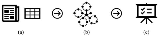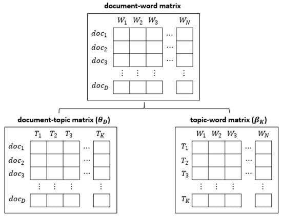 Mathematically, there are two matrices as the input and output of the LDA algorithm. The entry of a matrix row represents the distribution of word co-occurrence, as illustrated in Figure 1. The input matrix corresponds to the documents row () and the words column () across the entire dataset (dimension , is the number of documents and is the count of words), termed as “document–word matrix”. Each entry of a document–word matrix represents the count of words co-occurred in each document. This input matrix will be modeled by the LDA algorithm to create two output matrices. They are a document–topic matrix () and a topic–word matrix () (Figure 1) that distribute the previous former document–word matrix using throughout a set of topics (). The document–topic matrix () corresponds to the document rows () and the topic columns () (size , is the number of documents and is the number of topics). The entries of a matrix represent the co-occurrence of each topic within a single document. The topic–word matrix () corresponds to the topic rows () and the word columns () (size , is the number of topics and is the number of words). The entries of a matrix demonstrate the count of representative words in each latent topic. The interpretation of the LDA algorithm through this point of view is known as probabilistic matrix factorization, introduced by Hoffman et al. [].