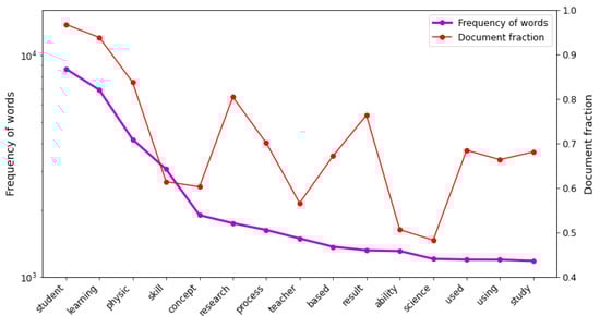After that, we employed the “gensim” library [] for lemmatizing and finding the bigrams. Lemmatization is the procedure to find the stem of some words in favor of the same meaning. For instance, “student” and “students” in the previous tokenized results should be lemmatized as “student”. We then looked for the frequently mentioned pairs of words within the dataset, bigrams. For instance, “conceptual understanding”, “problem solving” “scientific approach”, “critical thinking”, and so on (see more examples in Table 1). Bigrams should be combined by an underscore connecting the tokens. Finally, we had a “bag of words” containing 199,578 raw words and bigrams with 10,109 unique words. The tenth most frequent words in this current unfiltered data corpus are illustrated in Figure 3 below with their word frequency and fraction in each document (division between frequency and total of documents). The top five words that often co-occurred through our data corpus are “student”, “learning”, “physic”, “skill”, and “concept”. These representative words demonstrate the scope of PER literature has been satisfied in our dataset. Nevertheless, these frequent words should be filtered to make for more efficient computing time and to make the extracted PER topics more distinct.