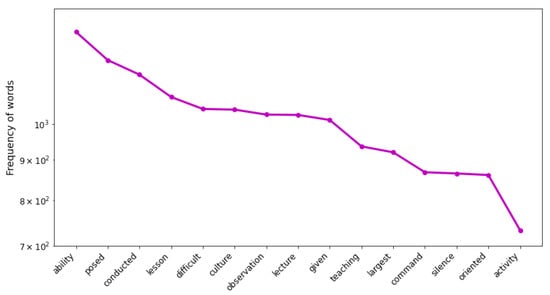 In this paper, we elected to exclude the most frequent words whose frequency was greater than 55% within the dataset. Furthermore, we also excluded the rarest words whose frequency was less than eight times within the data corpus. They were selected based on several evaluation processes to obtain the most optimum coherence measure. Admittedly, this selection was also inspired by the previous practices of thematic analysis by Odden, et al []. Obviously, it eliminated a substantial number of unique words and bigrams, approximately 7724 words. Then, we had the cleaned data as many as 2385 total words and bigrams for the next LDA analysis. This was actually a huge number of removals, but they did not contribute towards distinguishing the specific description of a topic []. As explained above, this filtered dataset would make the modeling time of the LDA algorithm more efficient since it would mathematically reduce the dimension of the LDA matrices (see Figure 1). These filtering processes decreased the size of our dataset from 10,109 to 2385 unique words and bigrams (see Figure 4). These filtered versions of the dataset determined the final LDA model of the Indonesian PER topics which were evaluated by multiple iterative modeling processes based on the mixtures of the number of topics (), hyperparameter , and random initialization (seed number) to obtain the most coherent topics within the literature. Furthermore, these topics must be qualitatively evaluated by PER experts to strengthen the solid topical description based on their experiences.