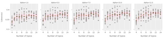 Several hyperparameters that should be tuned during the iterative process of LDA modeling are the alpha (), random seed number, and the number of topics (K) []. Alpha is a hyperparameter that determines the relative “mixedness” of topics extracted by LDA. Moreover, the previous study has considered the potential issue during the training of LDA model, namely the random initialization seed []. It could cause a significantly different set of topics extracted from a single LDA model. Therefore, the LDA results are recommended to be interpreted from multiple random seed numbers. To find the most optimum model based on the coherence measure, we should train a high amount of LDA model in considering the mixtures of different numbers of topics (K), alpha (), and random seed number. In this study, we selected a mixture of eleven numbers of topics (4 to 14), five alpha values (1, 5, 7.5, 10, 12.5), and ten selected different seed numbers. The different seed numbers were inspired by the method of repeated measurement in the physics laboratory []. The calculation of coherence values is represented by the moving dots in Figure 5 around the average coherence value (red dot). From these combinations, we trained 550 LDA models represented by the spread of coherence values in Figure 5.