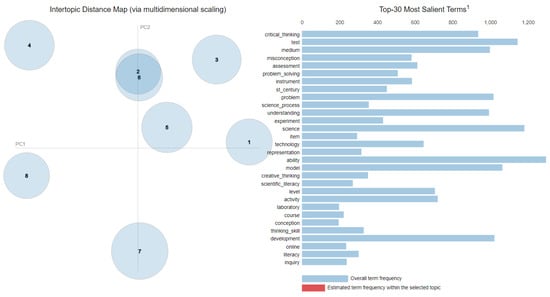 Using the “pyLDAvis” library provided by the python programming language, the relationship among the Indonesian PER topics can be determined in Figure 6. In this study, we characterized eight distinct Indonesian PER topics studied between 2014 and 2021. The size of the displayed bubble in Figure 6 represents the most influential research theme within the Indonesian PER literature, namely “educational technology”. The distance between the bubbles articulates the relative relationship of the topical results within a set of documents. We relatively found clear differences among the eight Indonesian PER topics produced in Figure 6. Even though “educational technology” has attracted the greatest focus of Indonesian PER scholars, it must be noted that the inter-topic distance map is constructed based on the multidimensional scaling of principal components (PC) emerging in the corpus. It is often assumed that it can be projected as a two-dimensional figure, as presented in Figure 6. Through this simplified visualization, we are assisted in illustrating the inter-topic relation that could be present among the emergent topics. This can be translated as the interdisciplinary nature of PER studies, as explained above.
