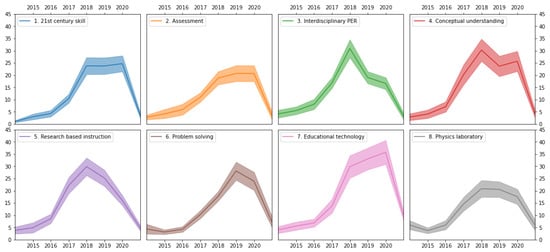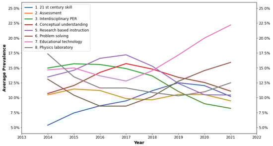 In RQ1, the interpretation of the LDA model was explained in two ways. First, LDA results were understood by carefully examining the most representative words in each topic. In Table 1, we provide the top ten words of each topic. Our interpretation of these would be confirmed when these words have made sense based on the face validity. Accordingly, we can enumerate these results as eight research themes. Second, once the name of distinctive Indonesian PER topics had been determined, we then performed the subsequent strengthening interpretations to explore the most influential papers in each topic (see Table 2). In this table, we merely provide the five best representative papers of each topic to maintain the readability of this paper. In fact, we considered fifty representative papers in each topic to further study the characteristics of eight Indonesian PER topics. This analysis was necessary to obtain the next face validity to the extracted topics as well as to define the clear definition of the topic. Thereafter, the final terminology of each topic was decided according to these two steps of consideration. In RQ2, the evolution of each topic between 2014 and 2021 was measured by the “prevalence” parameter. In this study, the prevalence was defined as the percentage of each topic in each year within the collection of the annual documents []. A highly prevalent topic may be greatly studied in certain years but less focused on in other years. Eventually, it will illustrate the clear evolution of Indonesian PER studies for seven years that have been attempted. These results visualized what has been worked on by the Indonesian PER community and the potential room for future studies that could be addressed in the further journey.