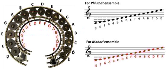 For transcribing the Sadhukarn main melodies from Thai into Western music notation, we decided to use the Thai Fine Arts Department method by Phra Chen Duriyanga [11] and Yun Khean [12] for determining notes and pitches played in Khong Wong Yai. Briefly, notation of Khong Wong Yai is written in a five-lines staff with treble clef in 2/4 m. The instrument consists of 16 tuned gongs arranged by pitch from low to high. For Thai traditional music, there are two scale systems or Thaang used to play with the instruments including Thaang Phi Phat (the scale system for Wong Phi Phat or a percussion ensemble) and Thaang Mahori (the scale system for Mahori ensemble or a combination of percussion and string ensemble). The difference between these two scale systems is that Thaang Phi Phat begins note C at the 7th pitch degree of a gong, whereas note C for Thaang Mahori shifts back to the 6th degree (Figure 1). According to the octave naming and Scientific Pitch Notation Method (SPN), the 1st gong head (from the far left) as the position of lowest pitch starts from bass D or D3. The following pitches from 2nd to 16th are E3, F3, G3, A3, B3, C4, D4…, B4, C5, D5, and E5 sequentially (Figure 1).