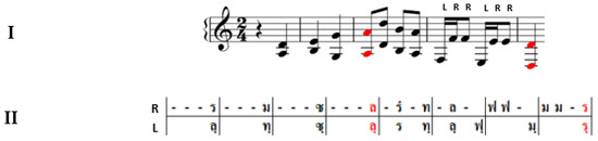 For transcribing music into a Thai music measure, we decided to use the Thai solfege notation system for determining notes, pitches, and hand striking. The Thai music measure is designed to write syllable notes in a two-layered horizontal table with vertical lines that separate the table into 8 measures equally [12,13,14]. Each measure consists of 4 rhythmic units, in which 1 unit equals 1 syllable or one sixteenth note in Western music. The total rhythmic length of one lined measure is 32 rhythmic units or 4 measures in Western staff notation. Especially for Khong Wong Yai, two layers on the music measure is set to determine hand striking; top row = right and bottom row = left (Figure 2).