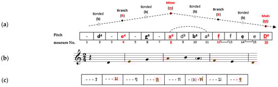 The format of rhyme music structure is designed as a horizontal lined table. The vertical lines separate a table into 16 measures. Each measure equals two Thai rhythmic units or one eighth note in Western staff notation. Thus, the total length of rhythmic units per one lined table is 32 Thai rhythmic units or 4 measures of Western staff notation. In order to assign data into a measure, only 16 units of Thai syllabic musical notation and/or tie symbol (-) occurring in rhythmic units of even number are obtained. To define Thai rhyme music structure, a skeletal note or “Look-Tok” in Thai musical terms is a necessary material used for the process. Briefly, the smallest pitch-unit in Thai music composition, Look-Tok, is a significant note that is played to present the end of a musical phrase [3,13]. The position of Look-Tok, according to Thai musical phrase length (one Thai musical phrase equals five measures in Western staff notation or eight measures in Thai music notation), is normally at the last beat of the phrase. In other words, it is placed permanently at the last rhythmic unit in Thai measure notation (at the fourth beat of measure eight) or the first accented beat of measure five of Western staff notation. For Thai musicians, Look-Tok has been known as “pillar tone” because it is used to define the melodic structure as well as the melodic contour in reductive form, and also specifically used to shape a melodic outline [3]. A melodic outline is similar to an ideal block for musicians to create individual idiomatic melodies and variants. Although there is traditionally one Look-Tok for one musical phrase, the other seven notes occurring in Thai music measures as last rhythmic units present their accented sound and function in a similar way to the characteristic of Look-Tok (Figure 3). Furthermore, it seems the pitches present rhyming sounds that link all musical phrases together, like rhyming verse (Figure 4). Therefore, we determined the seven partial notes mentioned above to be the secondary pillar tones and used these as the factors in order to represent the melodic rhyme and alliteration appearing in Sadhukarn main melody.