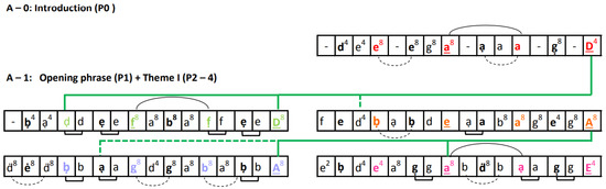 Demonstrating the introduction (Phrase 0), opening phrase (Phrase 1), and Theme I (Phrase 2–4) of the Sadhukarn main melody in rhyme music structure, which melodic rhymes including internal (above arc black line) and external (green line), alliterations (below arc black—dashed line and below black line), and scheme are comparable to Thai poetic structure.