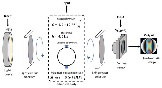 Into the polariscope, the optic phenomena, besides the stress principal stress difference, requires the material properties such as the stress optic coefficient C and thickness h. In those cases, the principal stress difference could be understood as a map with a specific intensity distribution and scaled by a defined stress magnitude. From this polariscope configuration, the emergent intensities follow Equation (1) according to the Jones calculus. This implies that generating synthetic experiments involves knowing the material optical properties C, body thickness h with its respective map of stress distributions , the spectral content of light source , and the spectral response of camera sensor []: