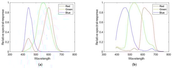 Spectral response of two camera sensors. (a) simulation of human vision; (b) Sensor Sony-IMX250. In case of the camera’s sensor, these graphs were obtained from the manufacturer data.