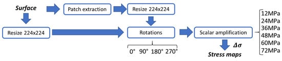 Finally, the last input accounts for the stress map . In this case, analytical surfaces are scaled to different stress magnitudes for responding to the absence of experimental data reports. In the process, the maps are resized to 224 × 224 pixels for matching with recent inverse problem proposals. The map generation process follows the diagram presented in Figure 4. There, the input surface is initially resized and posteriorly normalized into a new map. In a parallel way, patches are extracted from the initial map. Then, they are resized, rotated, and normalized into new maps. At the end, all the new maps are scaled to a stress magnitude taking into account three stress values, such as: 12 MPa, 24 MPa, 36 MPa, 48 MPa, 60 MPa, and 72 MPa.