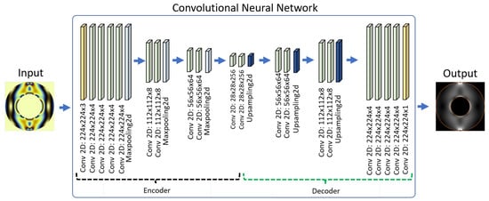 As mentioned previously, the main intention of our dataset is to provide different study cases that can support the designing and testing of computational algorithms for demodulating the stress field wrapped by the fringe patterns in digital photoelasticity studies. To show the data validity, we propose a simple model of a convolutional neural network to predict the stress maps by using as input the isochromatic images. The model was built by stacking convolutional layers as proposed in the VGG16 model []. In this case, Figure 5 shows the configuration for all the layers of the proposed net. In summary, it could be said that our model can be divided into two stages: the first one to encode the fringe information, which is similar to the VGG16 architecture, and the second one to decode it into a continuous stress surface.