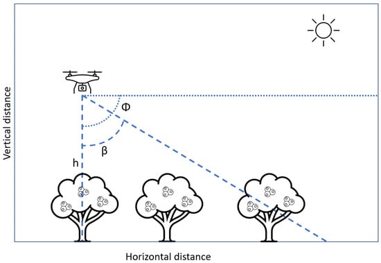 The flights were performed around 11:20 AM (local time), with an average sun elevation angle of 45° and an azimuth angle of 106°. Therefore, the shadows of the plants are clearly visible on the ground. The main difference between the two flights is that in the first one, the camera captured the images with a −90° gimbal pitch degree (Φ), therefore using β = 0° (nadir), whereas, during the second flight, the images were captured with a Φ = −60°, consequently using β = 30° (Figure 1). In this way, the flight mapping surveys were designed using DJI Pilot App (v1.9.0), setting up the UAV horizontal speed at 4 m/s and a flying height of 55 m above ground level (AGL), resulting in a theoretical average ground sample distance (GSD) of 1.53 cm/px. The side and frontal overlap ratios were 80%. In both flights, the camera was set up using “Single shot” mode within “photography mode”. The quality of the images was selected to the highest quality (5475 px × 3078 px), and ISO was configured manually at 400 and a 7.1 aperture. All photos were geotagged automatically by the DJI FC6310 RGB camera in EXIF format, capturing the data in a Lat/Long coordinate system (WGS84).