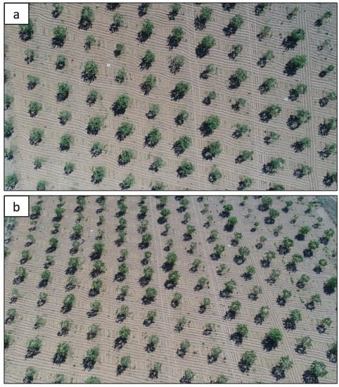 Figure 4 presents a ground-level photo showing the pistachio tree when the UAV images were taken. Regulatory pruning was carried out to manage vegetation growth while leaving the entire quantity of flower buds. In addition, the ground was kept free of any weeds that could affect image processing. However, some isolated weeds are present under the pistachio tree canopies as they are hard to eliminate.