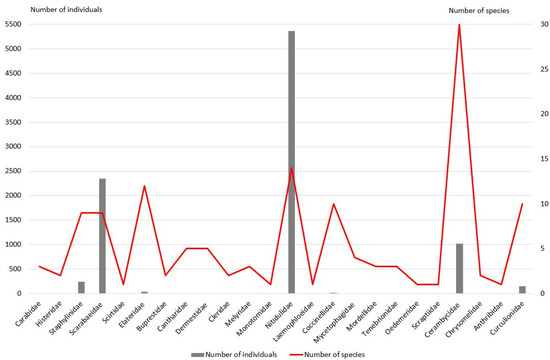 The number of specimens and biodiversity of Coleoptera families represented in beer traps in Smolny National Park (total data for 2018–2022).