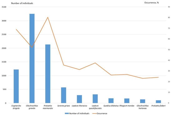 Glischrochilus grandis (Tournier, 1872) (Nitidulidae), Protaetia marmorata (Fabricius, 1792) (Scarabaeidae), Cryptarcha strigata (Fabricius, 1787) (Nitidulidae), Soronia grisea (Linnaeus, 1758) (Nitidulidae), Leptura thoracica Creutzer, 1799 (Cerambycidae), Leptura quadrifasciata Linnaeus, 1758 (Cerambycidae), Quedius dilatatus (Fabricius, 1787) (Staphylinidae), Rhagium mordax (DeGeer, 1775) (Cerambycidae), Glischrochilus hortensis (Geoffroy, 1785) (Nitidulidae) and Protaetia fieberi (Kraatz, 1880) (Scarabaeidae) were the dominant species in beer traps for 2018–2022 (Figure 2). In total, they accounted for 90.7% of all collected instances. This is a conditional allocation of species whose numerical abundance and occurrence were the greatest in five-year studies. Glischrochilus grandis was the most numerous species (35.2% of the total) and the third most common species (52.1%). Protaetia marmorata in traps was second in number (23.2%) and first in occurrence (80.4%). Cryptarcha strigata was third in number in 5 years of research (13.2%) and was second in occurrence (69.1%). Thus, most species were rarely found in traps (no more than 8% of the number of traps) with a small number of individuals (no more than 1% of the total number of individuals).