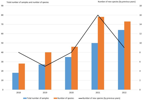 The maximum species diversity and abundance of Coleoptera was obtained in 2021. At the same time, when installing the largest number of traps in 2022 and in more diverse biotopes (64 traps), a smaller number of species was caught compared to 2021. As studies have shown (Figure 3), an increase in the number of traps in each subsequent year of the study has a certain effect on the identification of species new to the fauna, but up to a certain limit. We described a similar example above when comparing 2021 and 2022. Previously [35], it was indicated that in the fourth year of research in the Mordovia State Nature Reserve, the number of new species not previously caught decreased by five times (the number of trap exposures decreased only 2.6 times). Previously [36], it was suggested that two-year studies would be sufficient to study the biodiversity of a certain biotope, a limited forest area or a small region. For the best study of biodiversity, it is desirable not only to increase the number of traps from year to year or to place them in large numbers annually, but also to diversify the collection sites of samples.