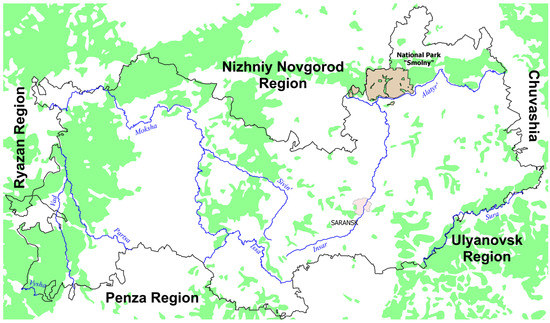 “Smolny” National Park is located in the northeastern part of the Republic of Mordovia between 45°04′ and 45°37′ E, 54°43′ and 54°53′ N (European Russia) (Figure 4). The maximum length from west to east is 35 km; from north to south, it is 18 km. The area is 36,500 hectares. The park is located in landscapes of mixed forests on the left bank of the Alatyr River (Volga River basin). The southern part of the park is a lower and flat area, with wide watershed spaces. It occupies the hills to the north of the Alatyr River, as well as small areas of the floodplain and almost all the near-red depressions. Here, the minimum marks of the park are 95 m above sea level. The main territory has heights of 100–160 m above sea level. The northern part of the park is more elevated, with absolute marks of 214–217 m above sea level. There are a lot of ravines. The climate is moderately continental. The average annual air temperature is −4–3.5 °C; precipitation is 440–550 mm. The predominant soils are sod-podzolic. Vegetation is represented by forests dominated by pine and birch. Pine forests predominate in the southern part and were planted after continuous logging at the end of the XX century. Birch trees also grow in the southern part. The northern part of the park is dominated by linden, oak, birch and aspen. These trees grow on the site of deforestation and are secondary forests [38].