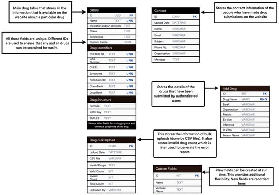 The data have been segmented into different tables for efficient storage. Figure 2 depicts different tables and the data fields used to store the drug data, and Figure 3 illustrates the same for data on users. The data types of each field and the type of constraints enforced (if any) are also highlighted.
