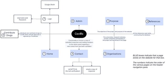The CoviRx web app’s top hierarchy consists of the admin panel [40] and the user interface. It was a design decision to keep the user interface interactive and straightforward. Users can interact with our tool using features such as the search engine, drug overviews, contact forms, drug submission forms, etc. Features of the website’s home page are depicted in Figure 6.