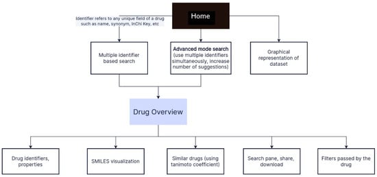 The standard and advanced search modes are two modes of usage, as depicted by Figure 8 and Figure 9, respectively. Both modes offer search-as-you-type [43] functionality. The significant difference between the modes is that only one identifier can be used to search for a drug in the case of normal mode. In the advanced search, multiple identifiers can be used simultaneously. The search results have been capped at five for the normal mode to reduce search time, and this limit is adjustable in the advanced search mode. The researchers can also choose a combination of different filters in the advanced search mode to restrict the drugs being displayed as per their requirement. The search results comprise drug metadata, i.e., drug synonyms, indication class, Simplified molecular-input line-entry system (SMILES) [44] representation, etc.