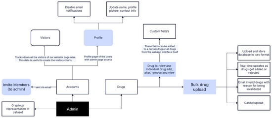 The admin panel is for users with admin rights for the web app. It has two sections: accounts (associated with the users) and main. Admins can use the main section to contribute/upload drugs access website analytics data and custom fields. A feature to invite other users to the admin panel has been added, and admins can use it to send out invites with a seven-day expiry. Features of the admin panel are depicted in Figure 7.
