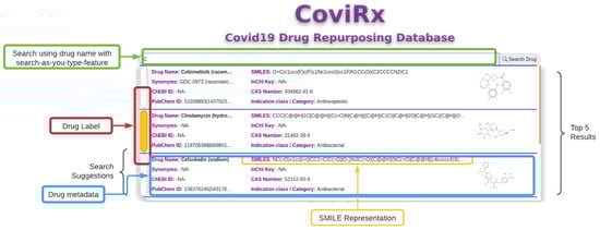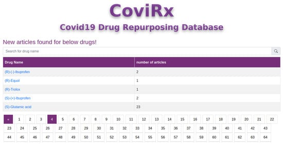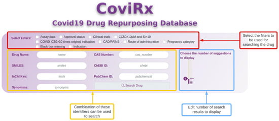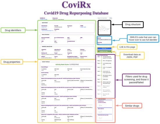 The following supporting information can be downloaded at: https://www.mdpi.com/article/10.3390/data7110164/s1. Table S1: Table listing Python libraries used for the development of CoviRx, Table S2: List of external APIs used by CoviRx, Figure S3.1: Drug upload form, Figure S3.2: Contact form, Figure S3.3: Identifiers available for normal search mode, Figure S3.4: Graphical visualization giving database overview, Figure S4.1: Website Analytics, Figure S4.2: Drug bulk upload feature, Figure S4.3: Email sent by CoviRx to correct invalidated drugs, Figure S4.4: Invitation email, Figure S4.5: Tech stack used for development, S5: Tanimoto Coefficient formula, S6:Website general information, Link S7: Code Repository, Link S8: Code Usage, S9: API calls available, S10. Additional information regarding reusability of CoviRx, S11: Supplementary references are included in “CoviRx-supplementary-information” file; “Total list of 214 drugs-table” is shared as a separate file which lists the drugs with the highest activity scores in CoviRx.