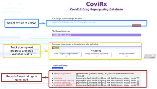 To facilitate the process of bulk drug upload, CoviRx has a feature which enables the admin users to upload large amounts of drug data in one go by directly submitting a CSV file. A single drug upload/delete/modify functionality is also available. CoviRx evaluates every drug against multiple constraints before adding it to the primary database. These constraints ensure the validity of the drugs, so drugs that fail them are considered “invalidated” and shared with the admin users to reverify the data. Figure 12 depicts the various sub-features of the bulk upload feature.