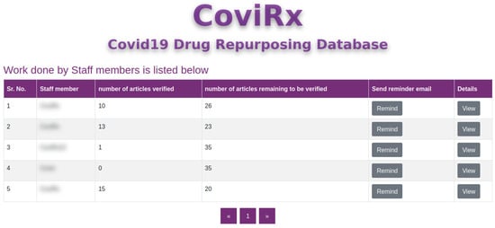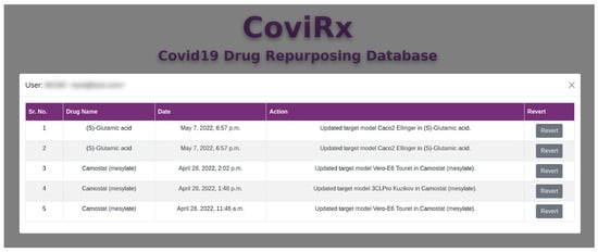 Since CoviRx crowd-sources the article verification job to pharmacy students, it becomes imperative to monitor the articles being verified, as shown in Figure 16. CoviRx also allows admin superusers (the highest administration privilege) to revert the changes made by admin users so that any incorrect change can be undone, as shown in Figure 17. In the future, the manual verification process of scraped articles can be automated using NLP techniques [54].