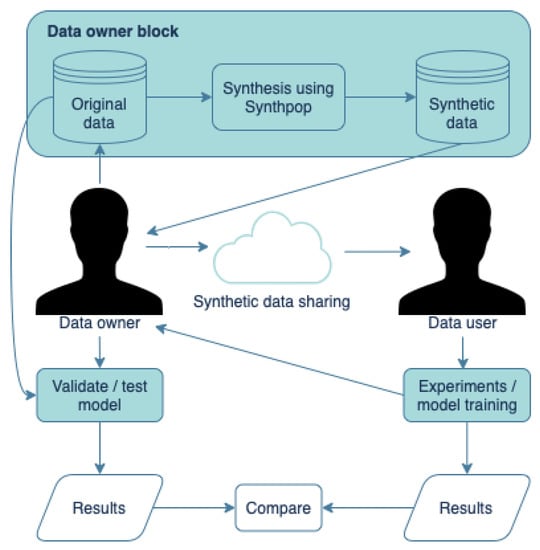 Current data-sharing systems, including SQLShare and DataHub, promote collaborative data analyses but fail to consolidate privacy-preserving prospects or means to manage sensitive data. Many other tools using AI methods, mainly GANs, have been developed which synthesize the data. Most AI-based data synthesis methods are designed to work on imaging data and do not work for microdata. Some do; however, either they are not free to use or come with limited access to the tool’s capacity, such as Tonic [26], Hazy [27], Datomize [28], and Mostly AI [29]. The synthpop package is an alternative to the previously mentioned methods for data synthesis. It is free to use and is capable of handling any microdata; there is no access limitation to the tool. It [30] was utilized in 2018; a synthesized version of highly sensitive data probing the role of ovulatory changes on sexual desire and behavior was publicly released [31]. The data set consists of 26 thousand of diary entries from women. Since sexual diaries are extremely sensitive and hard to anonymize completely, the data collector did not request consent from participants to make data publicly available but instead synthesized the data and made them publicly available for secondary data analysis. Figure 1 illustrates the data synthesis process for data sharing with data users and how synthetic data models can be verified and tested using original data by the data owner while maintaining the subject’s privacy. In this study, the performance of synthpop [30], which produced a synthetic version of data that is meant to be anonymous, was explored and examined by measuring the impacts of the data synthesis process.